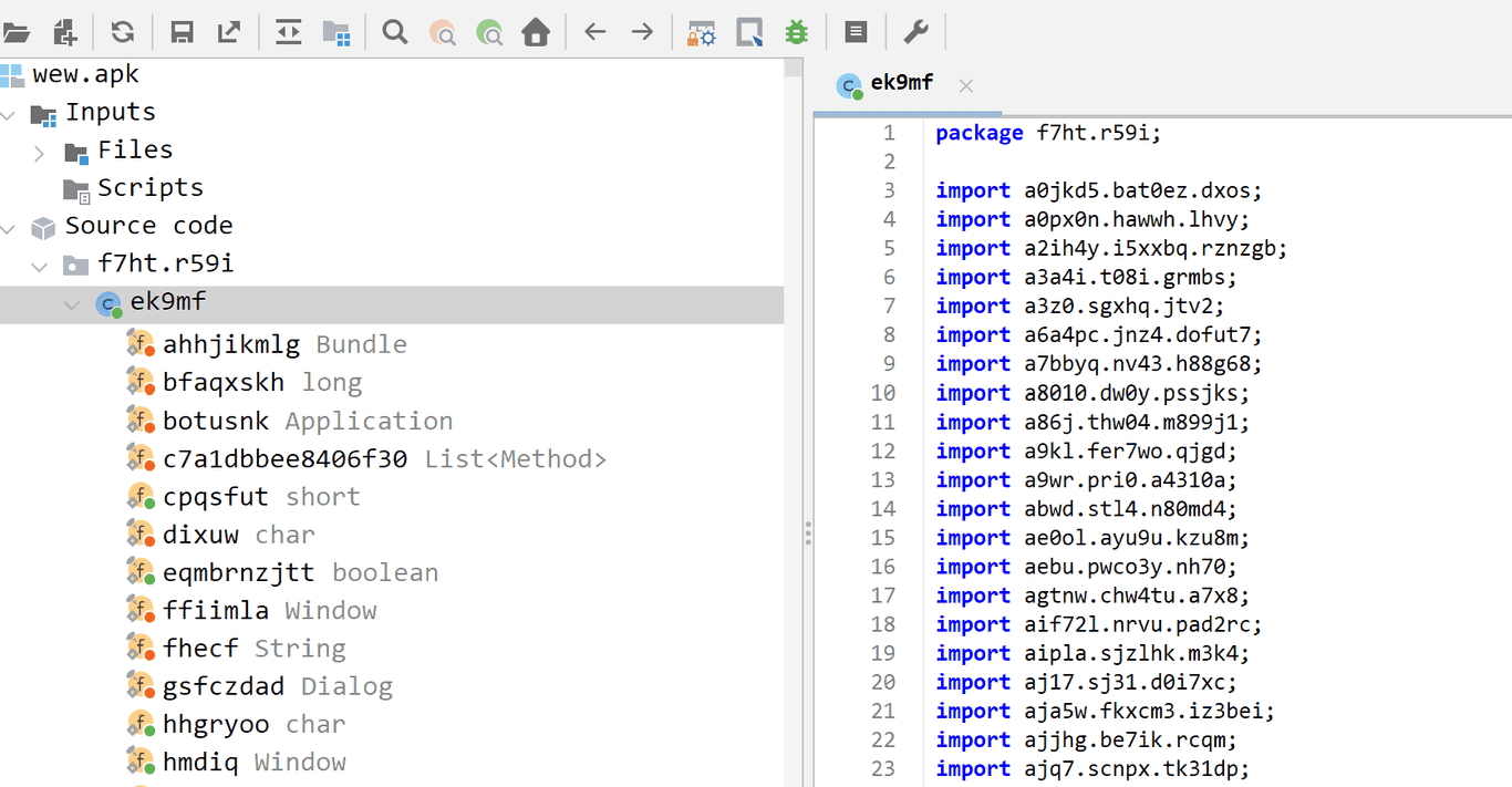 该功能可以对DEX文件内部的类的名称进行混淆重命名,使得类名会变成无意义的字符串,可以有效提升静态分析的难度