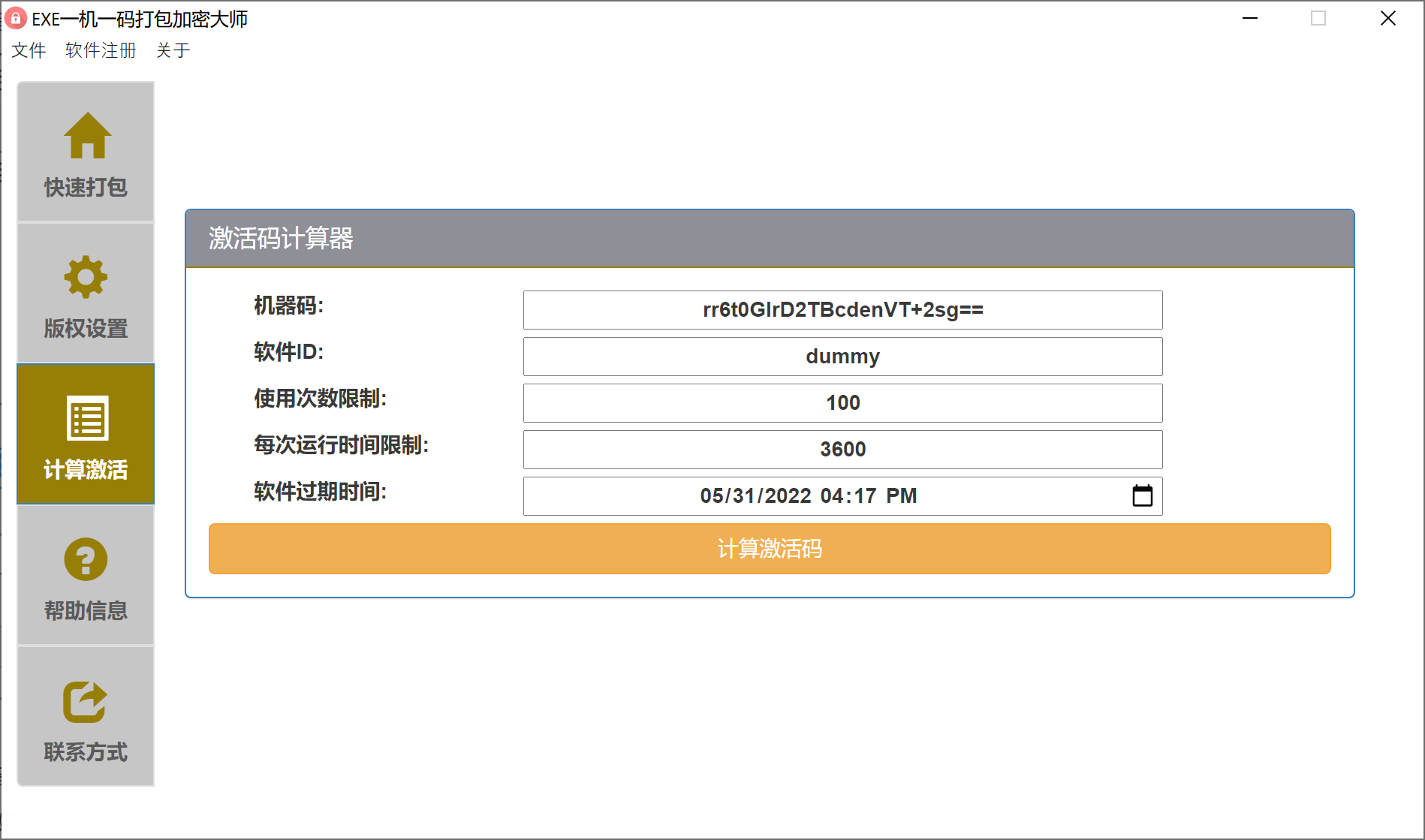 作者拿到机器码以后,在计算激活页面,填写用户的机器码,并填写打包时候的软件ID, 同时可以设置使用次数限制,每次运行时间,软件过期时间等: