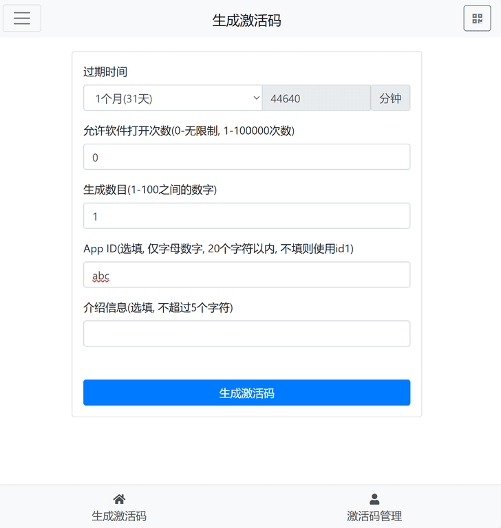 - 在后台管理页面, 我们输入刚才打包使用的软件ID, 然后点击生成激活码: