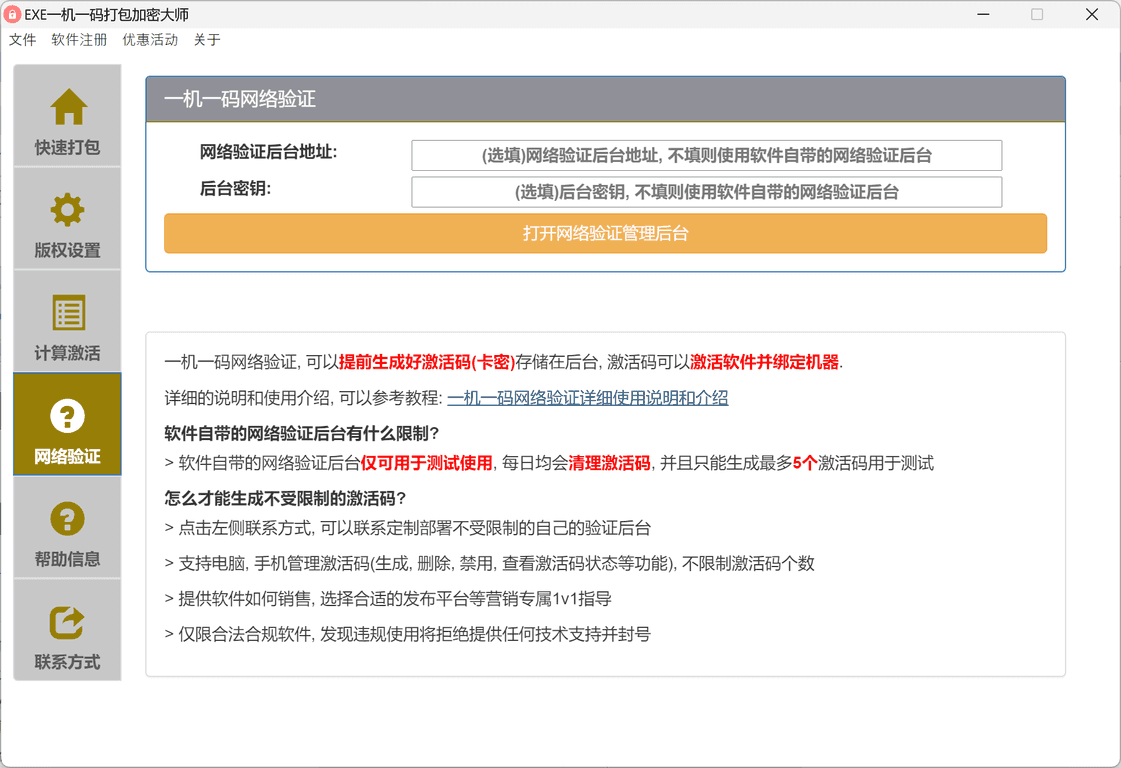 - 加密打包完成后, 可以生成激活码备用, 在软件界面左侧, 点击网络验证