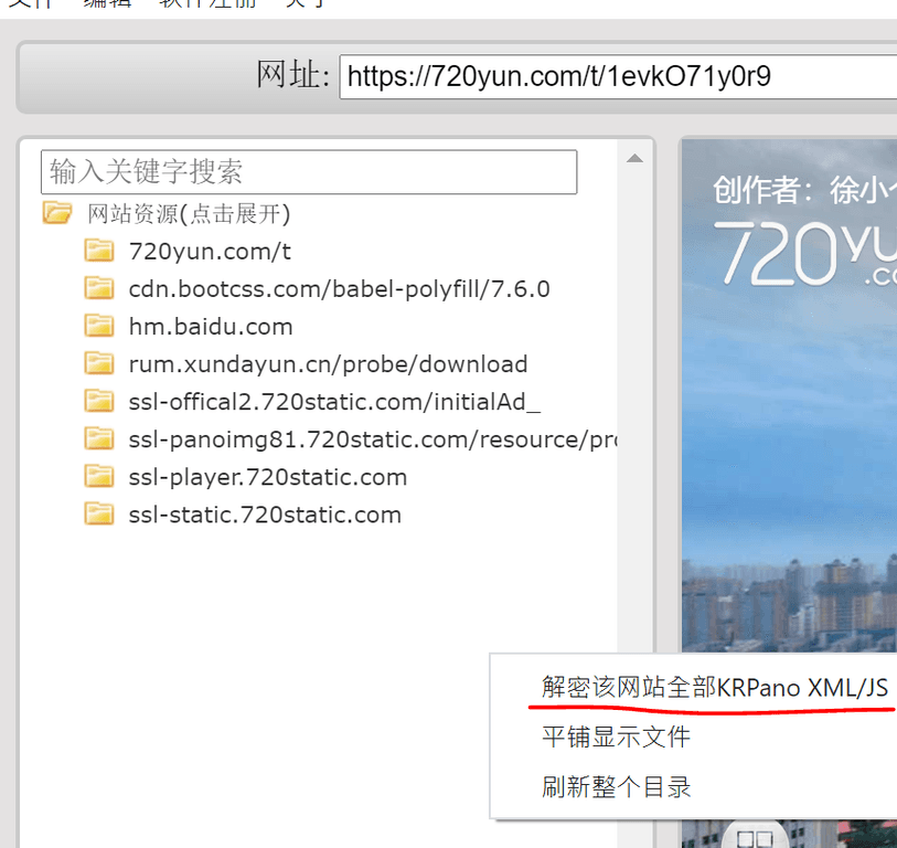 在软件任意位置,点击右键,选择解密该网站全部KRPano XML/JS