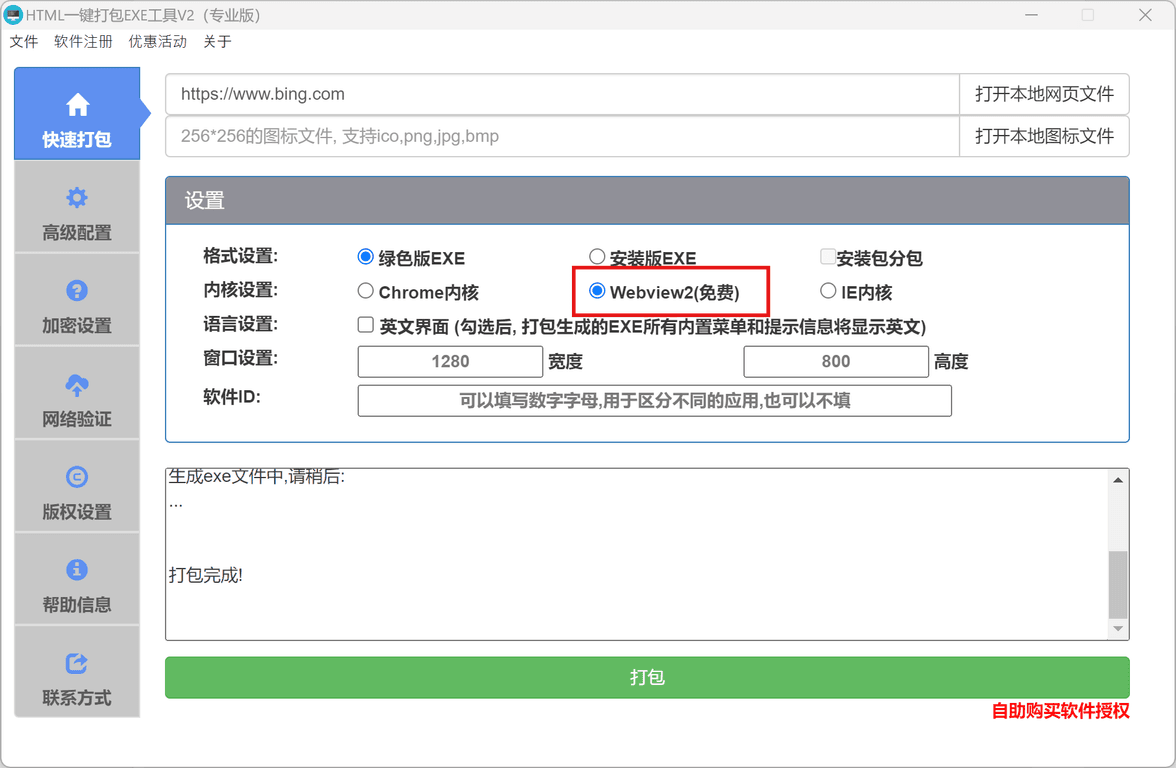 - 使用Webview2内核打包生成的EXE文件没有广告信息。