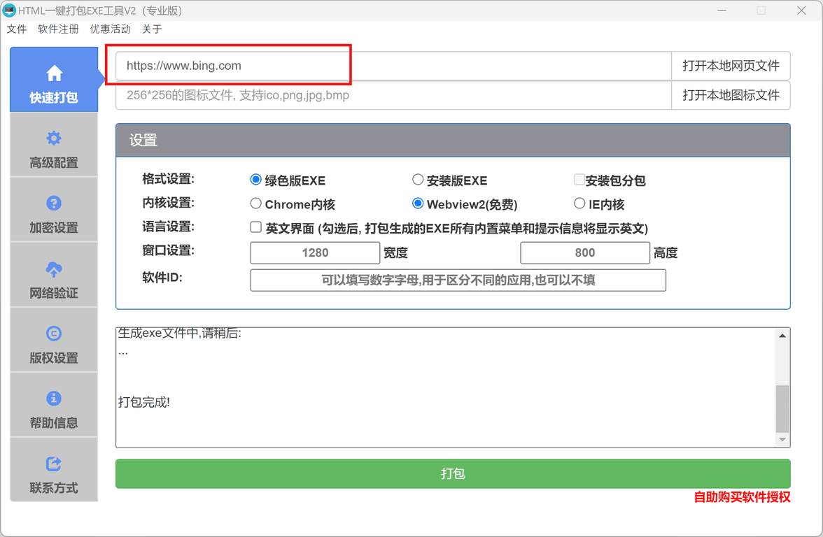 点击主页上的 打包 按钮,即可生成EXE文件。生成的文件无广告,并可永久使用。